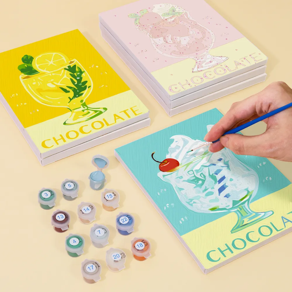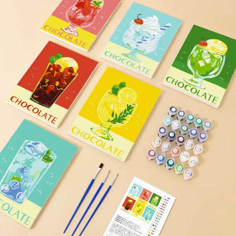“Chokoladedrikke” Mini Male efter Numre-sættet er en oplevelse for alle sanser – helt kaloriefri. Flødeskumsklar varm chokolade, med flødeskum eller skumfiduser, skaber varme, hyggelige stunder som et kærligt designet motiv. Ideelt til kolde dage, afslappede aftener eller som en søde gave til chokoladeelskere. Det fortrykte minilærred, nummererede akrylmalinger og en pensel gør maleriet let, afslappende og fuld af glæde.