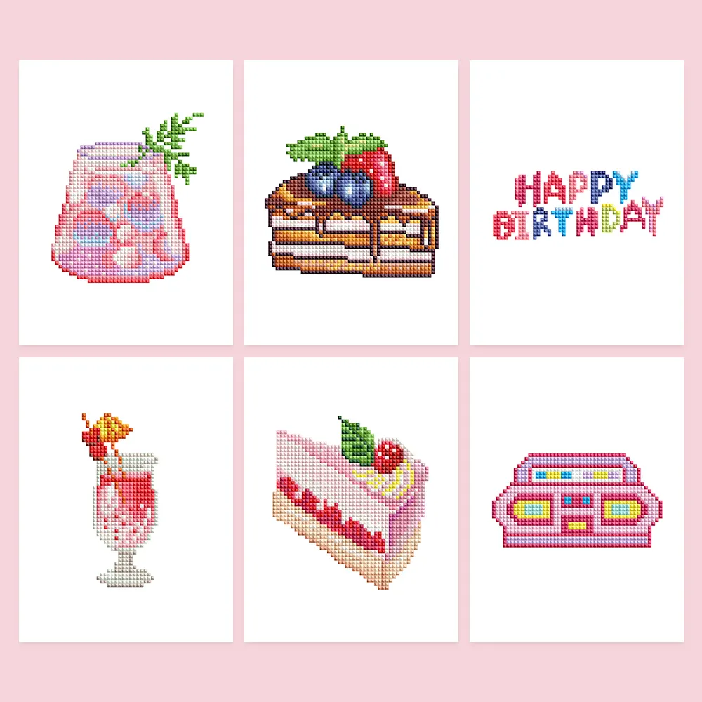 Sig “Tillykke med fødselsdagen” på den mest kreative måde med vores 6-pack “Fødselsdagsønsker Kollektion”! Dette sæt fra vores Mini Diamond Paintings-sortiment er den perfekte løsning til unikke, håndlavede fødselsdagskort eller gavekort. I denne pakke finder du seks forskellige, muntre fødselsdagsdesign – for eksempel en farverig kage med lys, festlige balloner, en flot gaveæske og “Tillykke med fødselsdagen”-skriften.
