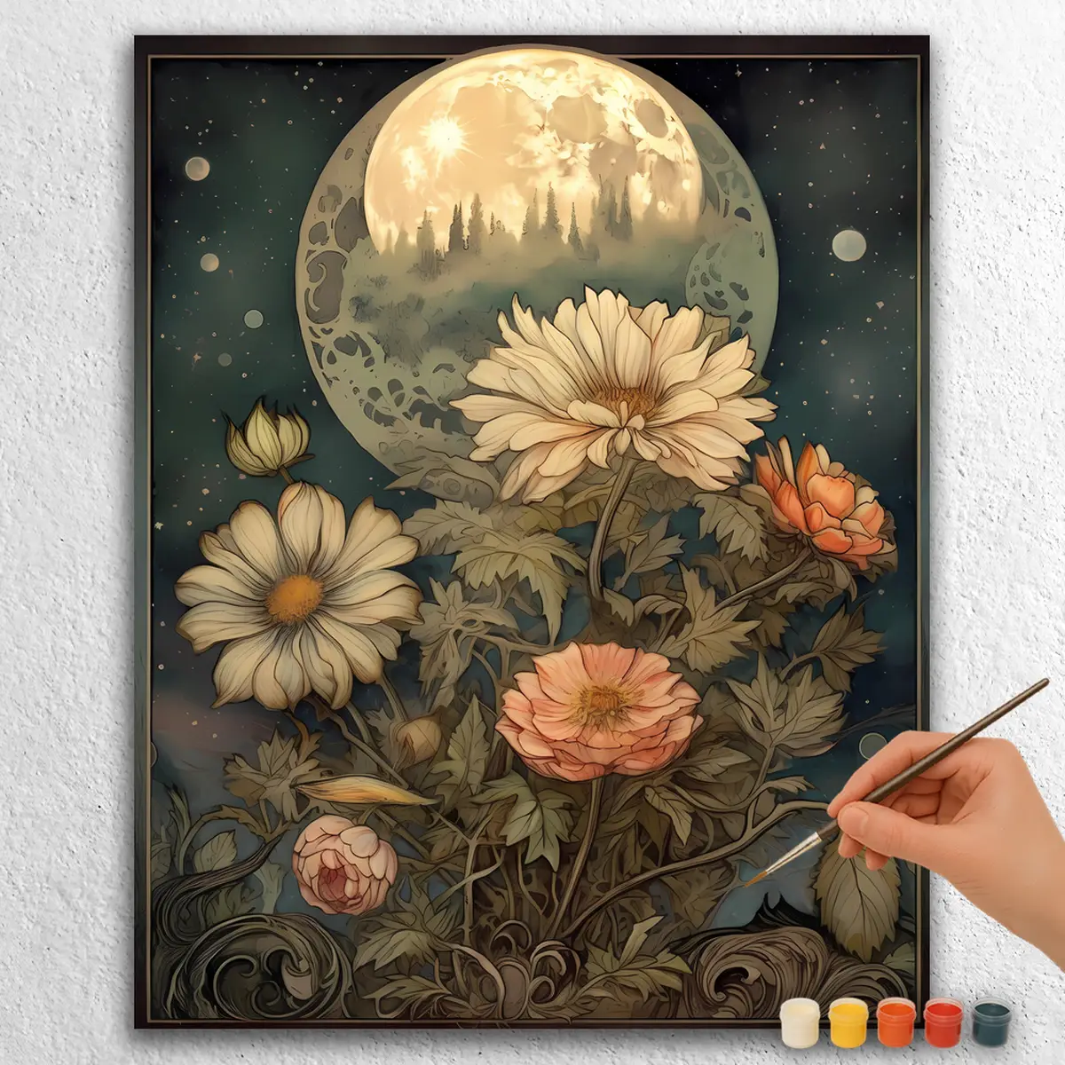 Bring magi til dine vægge med Enchanted Moon Flowers. Dette maling efter numre-sæt lader dig skabe en fredfyldt scene med en glødende måne omgivet af livfulde blomster. Perfekt til begyndere eller erfarne kunstnere er det en sjov måde at slappe af på, mens du skaber kunst. Sættet indeholder lærred, maling og pensler af høj kvalitet. Følg numrene for at bringe denne fortryllende scene til live og tilføj et strejf af mystik til ethvert rum.