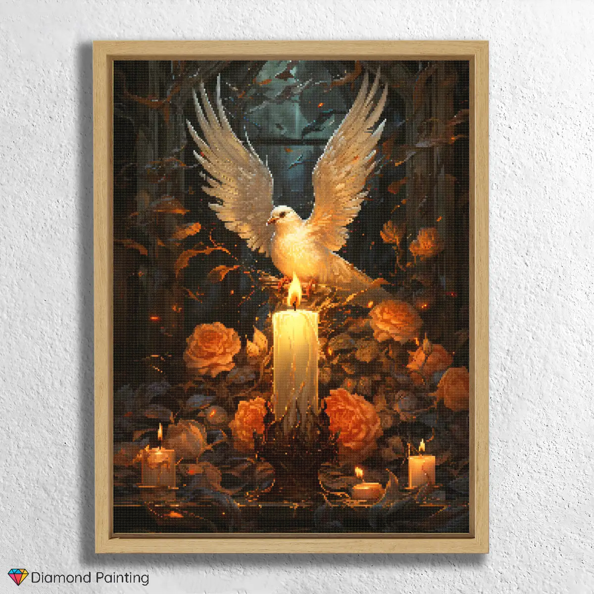 Find fred og åndeligt lys med vores andagtsfulde Diamond Painting “Hellig Due og Lys”! Dette sublime motiv fanger den rene symbolik i en Hellig Due, ofte et tegn på Helligånden og fred, der svæver blidt over et glødende Lys. Hver glitrende diamant hjælper dig med at bringe dueens fine vinger, flammens varme, gyldne lys og auraen af Guddommelighed til live. Det er en hyldest til tro, håb og den stille skønhed, der bor i disse betydningsfulde symboler. Ideelt Diamond painting for enhver, der søger en kilde til inspiration, eftertanke og dyb religiøs mening i deres hjem.