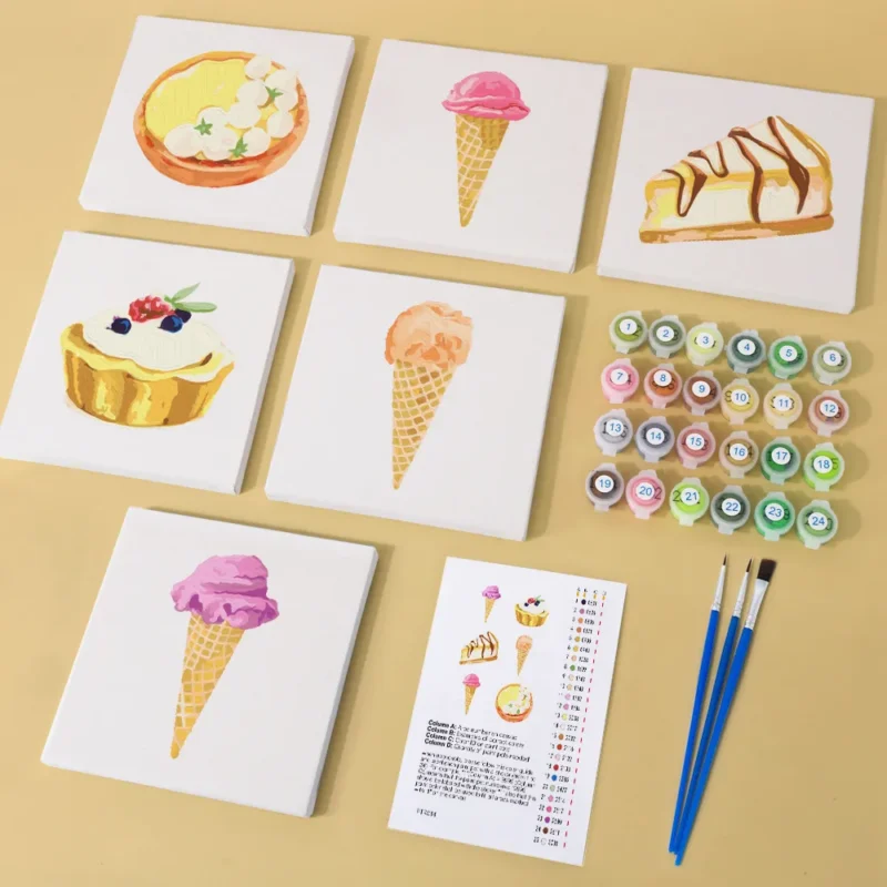 “Is”-mini-malediagram-sættet bringer sommerlig friskhed og sødt sjov på lærredet. Uanset om det er i vaffel, i bæger eller med farverige topping – de livfulde isdesigns sætter dig øjeblikkeligt i godt humør. Perfekt til kreative pauser, til børn eller som en original DIY-gave. Det forhåndstrykte minilærred, de lyse akrylmalinger og penslen sikrer en afslappet maloplevelse fuld af farve og glæde.