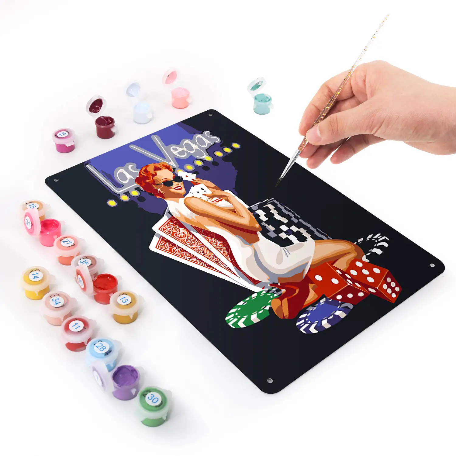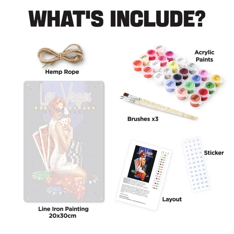 Bring Las Vegas' pulserende ånd til din bar eller dit hjem med vores unikke DIY male-efter-numre metalplakat. I størrelsen 20x30 cm (7,8×11,8 tommer) har denne plakat i vintage-stil afrundede hjørner til et elegant finish. Perfekt til at tilføje et strejf af nostalgi og kreativitet til dit rum, er denne metalplakat designet til både at være dekorativ og underholdende. Mal efter numre for at bringe dette ikoniske motiv til live og skabe et personligt kunstværk, der afspejler din stil.