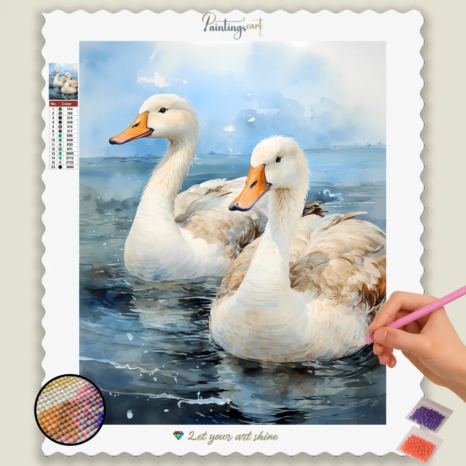 Erleben Sie die atemberaubende Anmut der Natur mit unserem bezaubernden “Erstaunlichen Schwanenpaar” Diamond Painting! Dieses exquisit gestaltete Motiv fängt die unvergleichliche Eleganz und tiefe Zuneigung von zwei Schwänen, ein, die mit ihren anmutigen Hälsen eine perfekte Einheit bilden. Jeder funkelnde Stein hilft Ihnen dabei, ihr makellos weißes Gefieder, ihre synchronen Bewegungen und die majestätische Ruhe des Wassers, auf dem sie gleiten, lebendig werden zu lassen. Es ist eine Hommage an bedingungslose Liebe, die zeitlose Schönheit von Vögel, und die Harmonie wahrer Partnerschaft. Ein ideales Diamond Painting für alle, die sich nach Romantik, einer Verbindung zur Natur und einer Note erhabener Ästhetik in ihrem Zuhause sehnen.