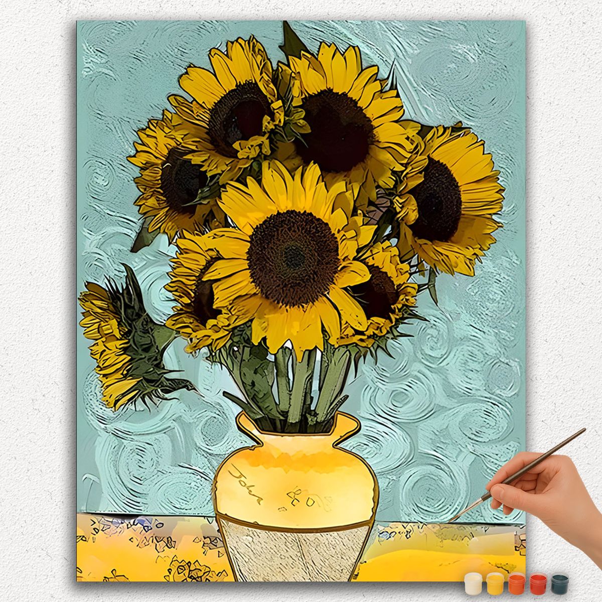 Lleve el calor del verano a su hogar con nuestro Kit de Pintura DIY Girasoles en Jarrón. Este juego de pintar por números le permite crear una impresionante obra de arte de girasoles amarillos brillantes dispuestos en un jarrón azul clásico.