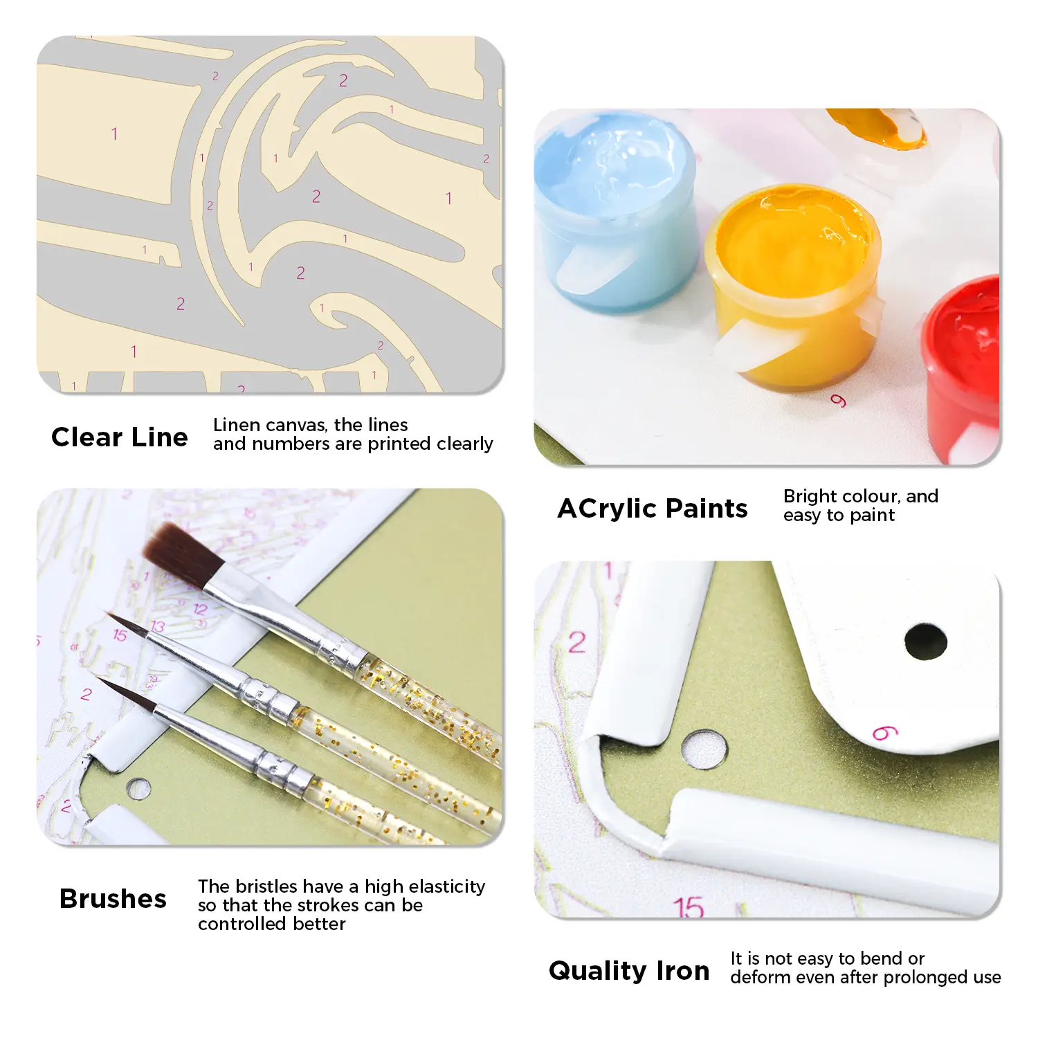 Vous recevrez tous les outils et accessoires nécessaires pour réaliser votre projet de peinture numérotée sur affiche métallique dans le kit.