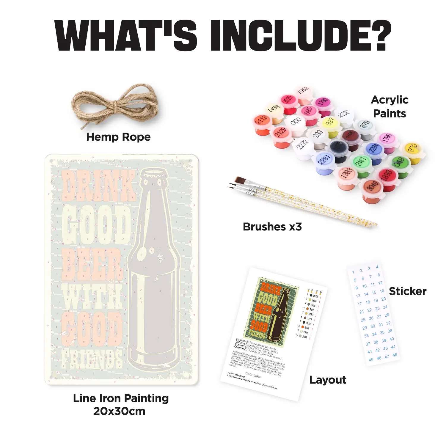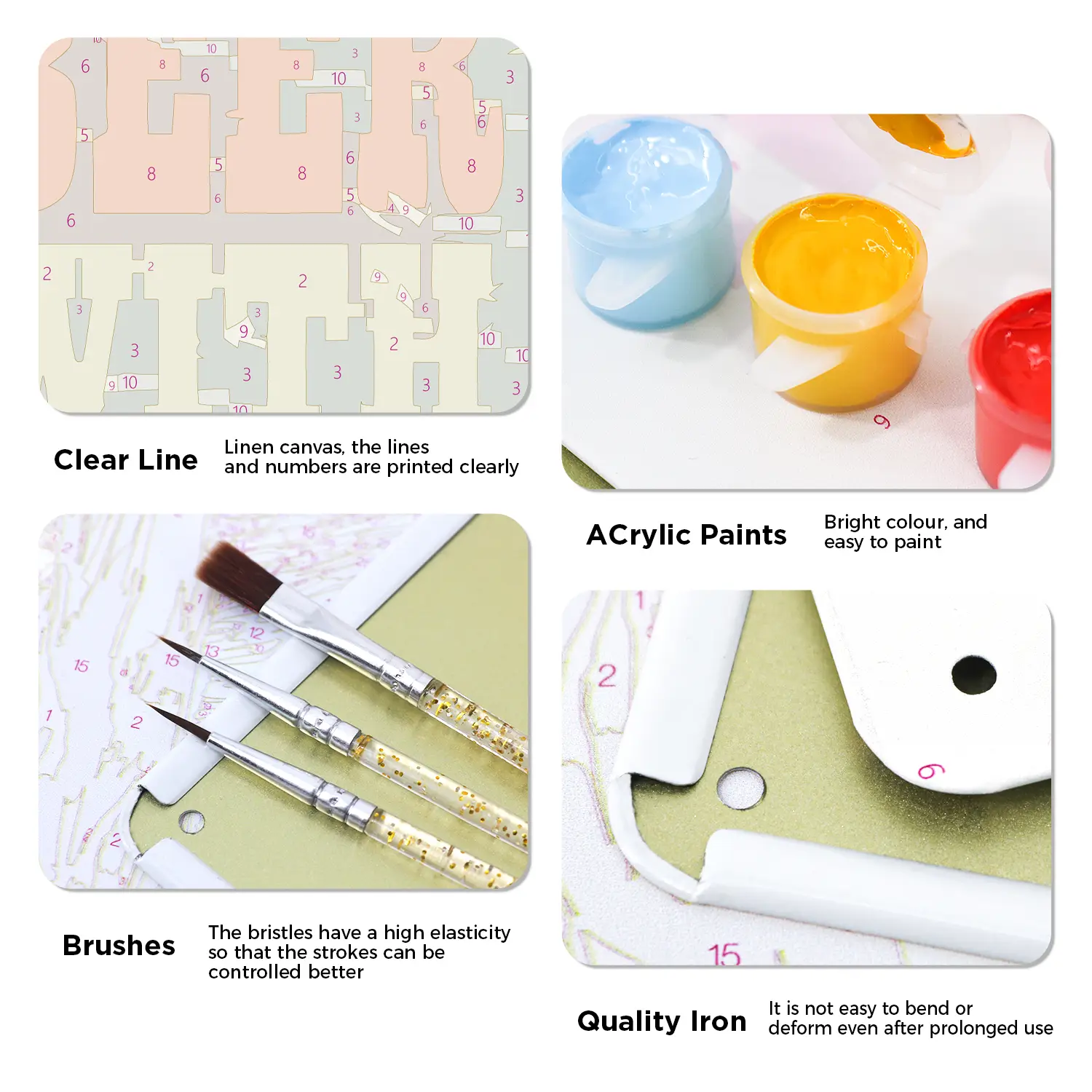Nel kit riceverai tutti gli strumenti e gli accessori necessari per completare il tuo progetto di pittura numerata su poster metallico.