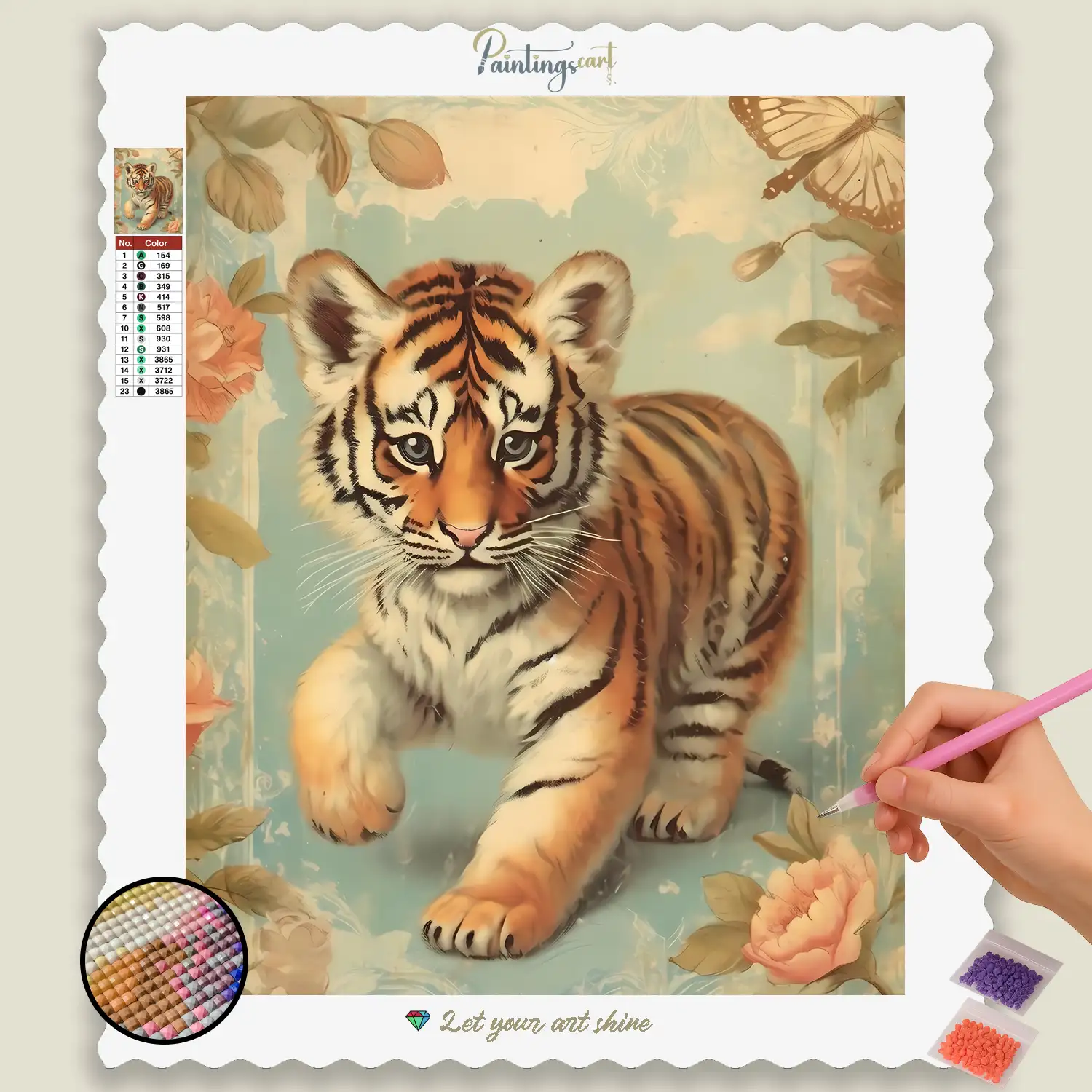 Dive into the fascinating world of big cats with our captivating Diamond Painting “Baby Tiger”! This impressive motif captures the still delicate, yet already majestic aura of a young tiger, a symbol of strength, grace, and untouched wilderness. Each glittering stone helps you bring its distinctive stripes, piercing eyes, and the vibrant energy of this cub to life. It is a tribute to the beauty and power of wild animals and a reminder of nature’s preciousness. An ideal Diamond Painting for anyone with a fondness for exotic animals, who appreciates the elegance of big cats, and wants to make a powerful statement in their home.