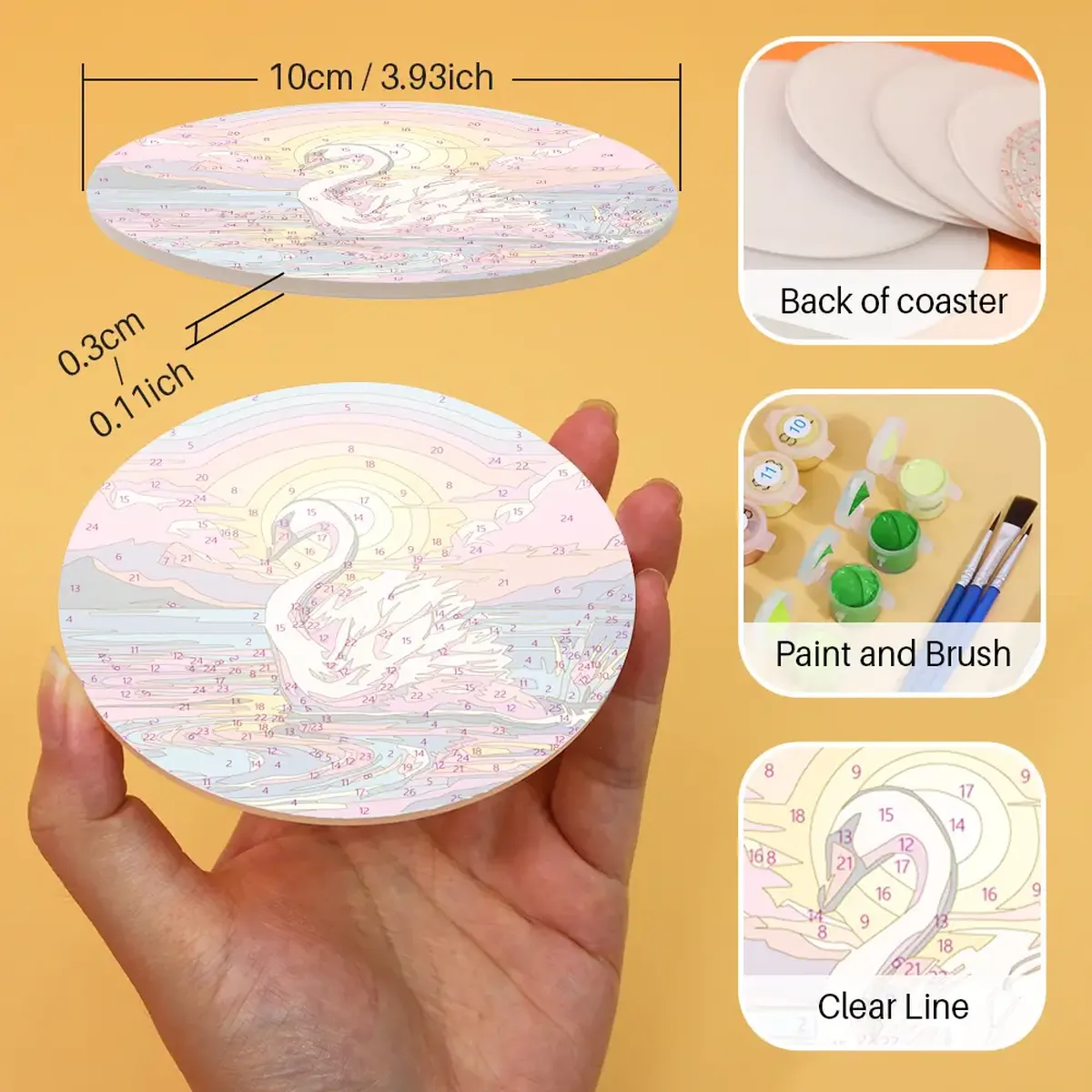 The DIY Coasters have a diameter of 10 cm/3.93 inches and a thickness of around 0.3 cm/ 0.11 inches.