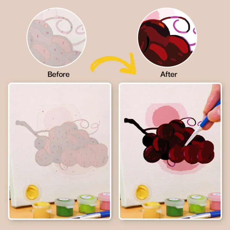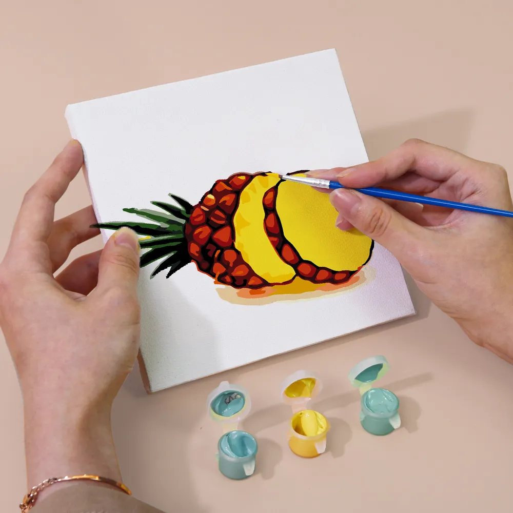 The “Fruits and Vegetables” mini paint-by-numbers set brings fresh colors, healthy variety, and creative energy to your canvas. From crisp carrots to juicy strawberries, this motif combines enjoyment with artistic expression. Ideal for kitchen decor, small DIY projects, or as a gift idea for healthy connoisseurs. With a pre-printed mini canvas, bright acrylic paints, and a brush, the painting experience is simple, colorful, and relaxing – even for beginners.