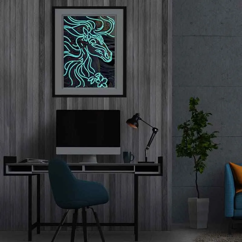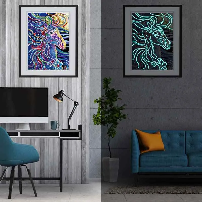 Capture the soul and majestic power of the horse in a truly magical work of art! Our “Ghost Horse” Diamond Painting displays the powerful and graceful silhouette of a galloping horse during the day. But at night, its true magic unfolds: special luminous diamonds, incorporated as a glowing mane or magical contours, begin to shimmer in the dark, giving the animal an ethereal, ghostly presence.