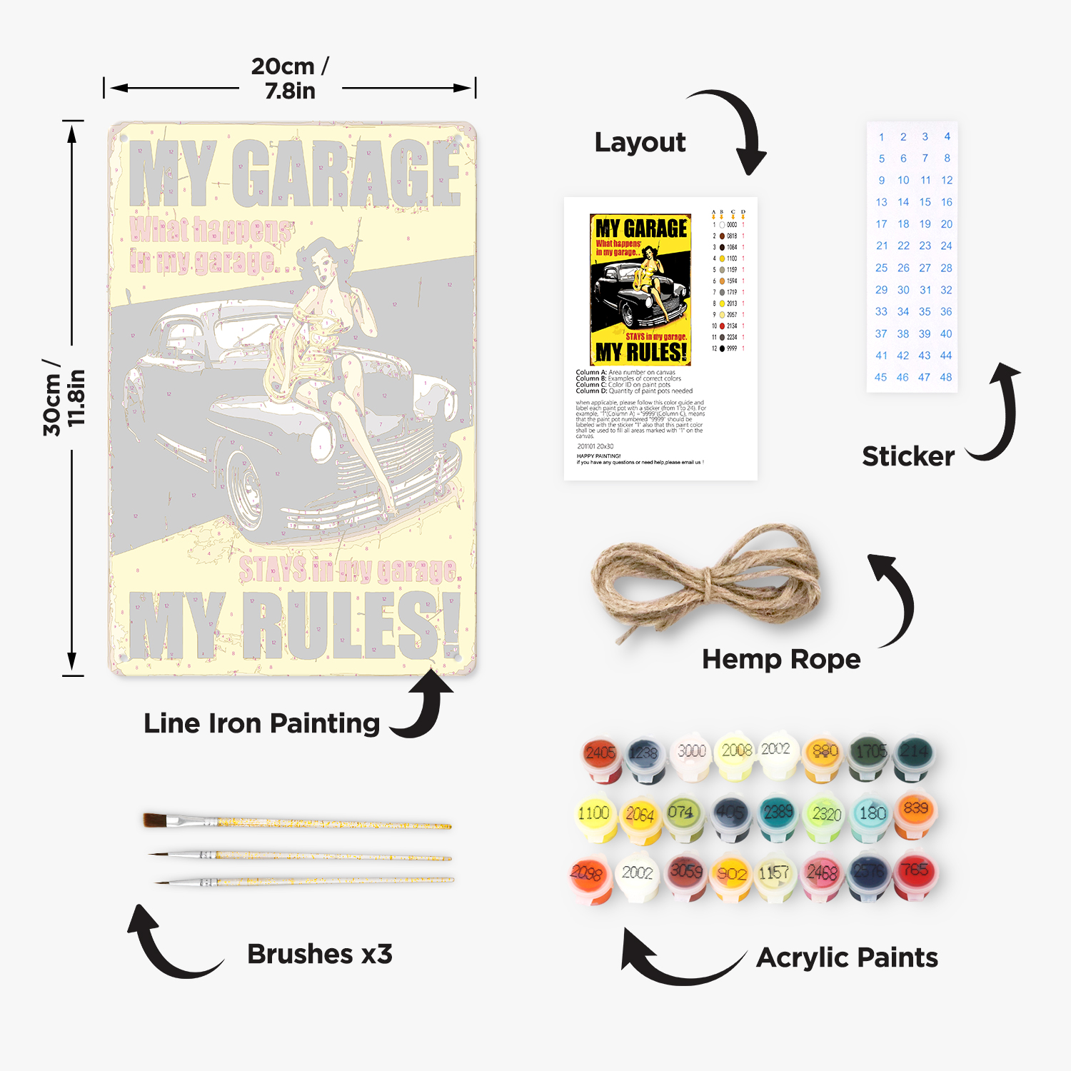 Elevate your bar or home decor with the My Garage My Rules DIY metal poster. This vintage-style poster measures 20x30cm or 7.8×11.8 inches and features rounded corners for a sleek look. Perfect for adding a touch of personality to your space, it combines functionality with style. The metal finish gives it a durable and modern feel, making it a great addition to any room.