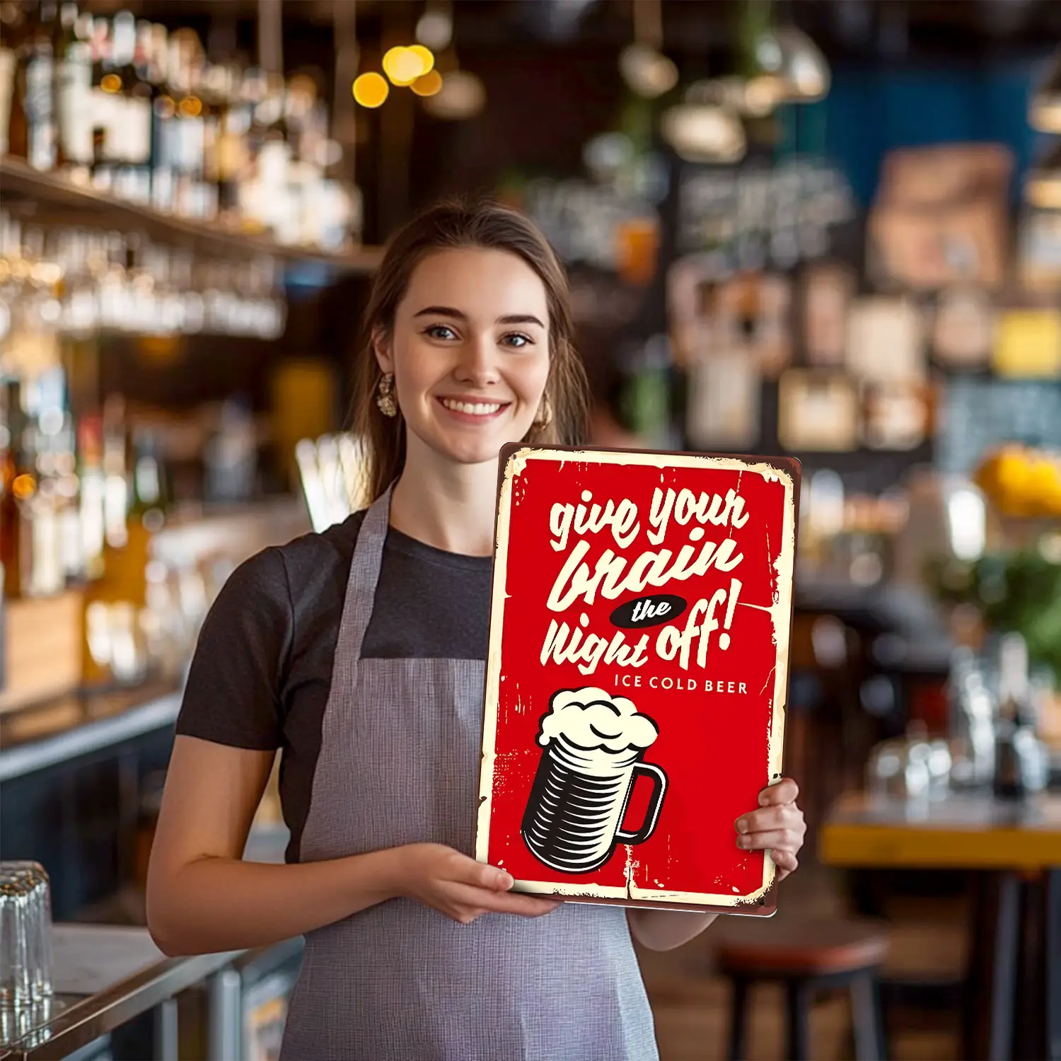 Elevate your bar or home decor with the Night Off Bar Metal Poster. This vintage-style poster measures 20x30cm and features rounded corners for a sleek look. Made from durable metal, it adds a touch of nostalgia and sophistication to any room. Perfect for those who appreciate retro aesthetics, this poster is sure to spark conversations and create a unique ambiance.
