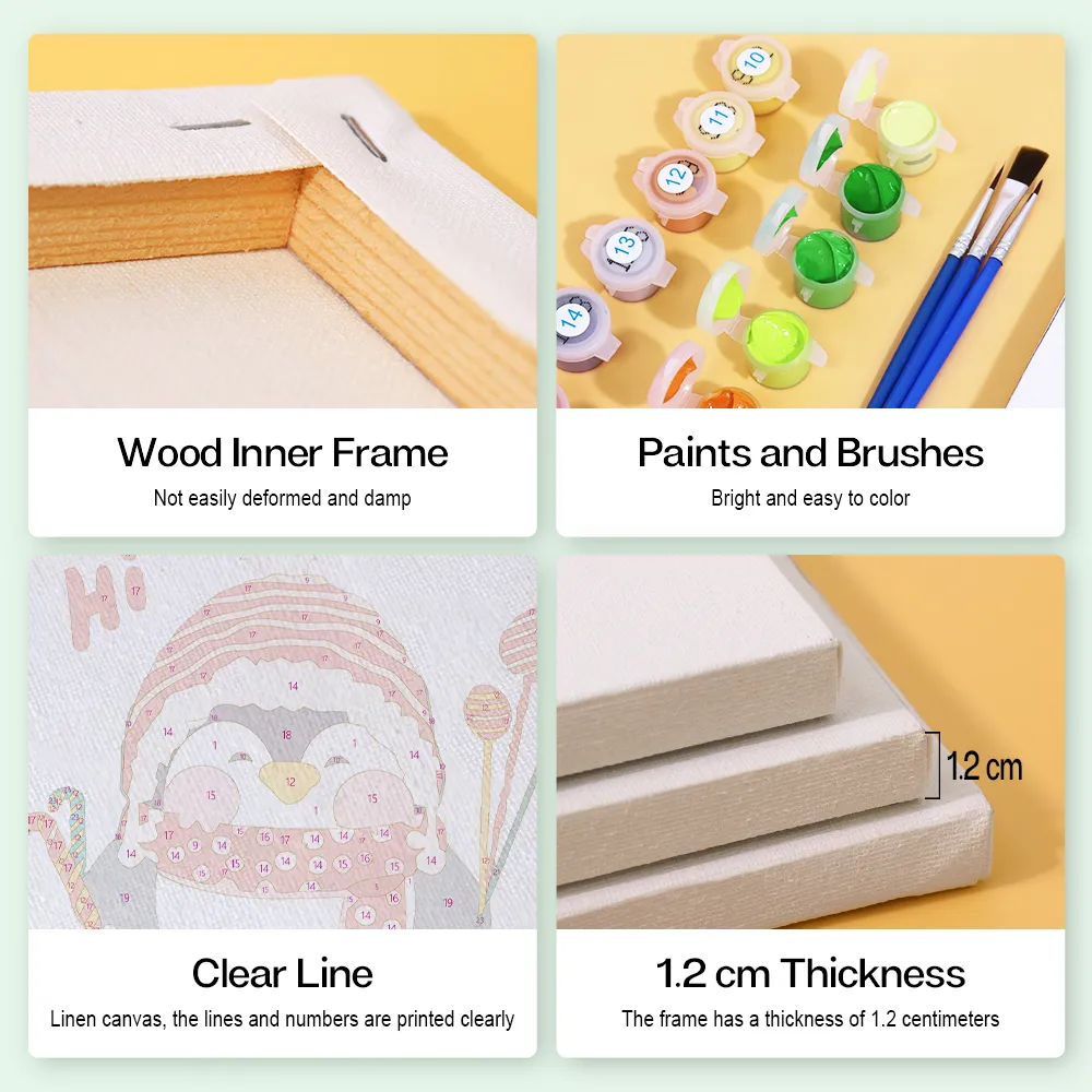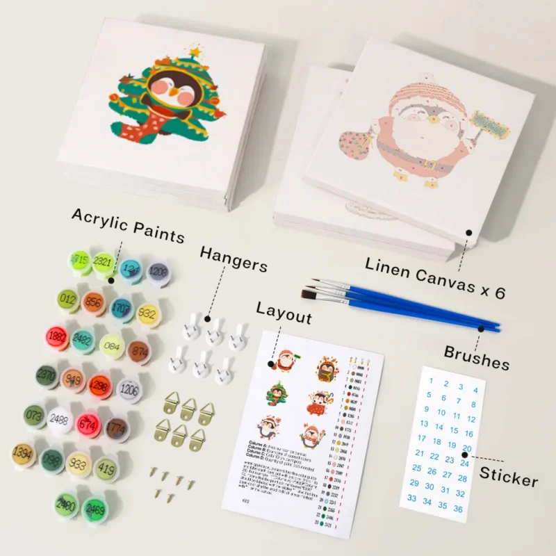 Bring festive cheer and winter charm into your home with the “Sweet Christmas” Mini Paint by Numbers set. The cute design with Christmas elements like gifts, animals, or fir trees will put a smile on everyone’s face. Perfect as a small DIY project during Advent or as a loving gift. The compact canvas, the numbered acrylic paints, and the matching brush make painting easy even for children and beginners.