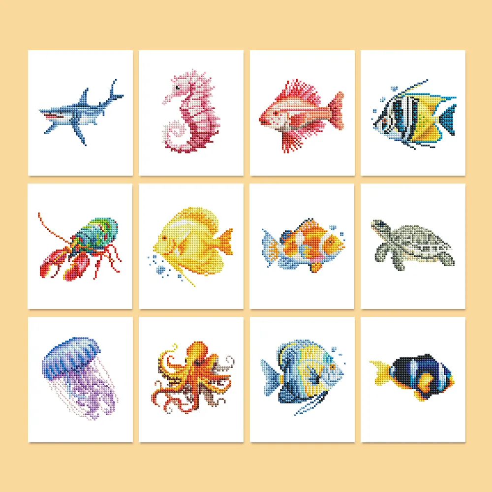 Dive into a creative ocean adventure with our 12-piece “Underwater World Collection” set! This set from our Mini Diamond Paintings range is a colorful journey to the most fascinating inhabitants of the deep. In this pack, you’ll find twelve different, enchanting marine creatures – from the playful dolphin to the graceful sea turtle, the cute seahorse, and the colorful clownfish.
