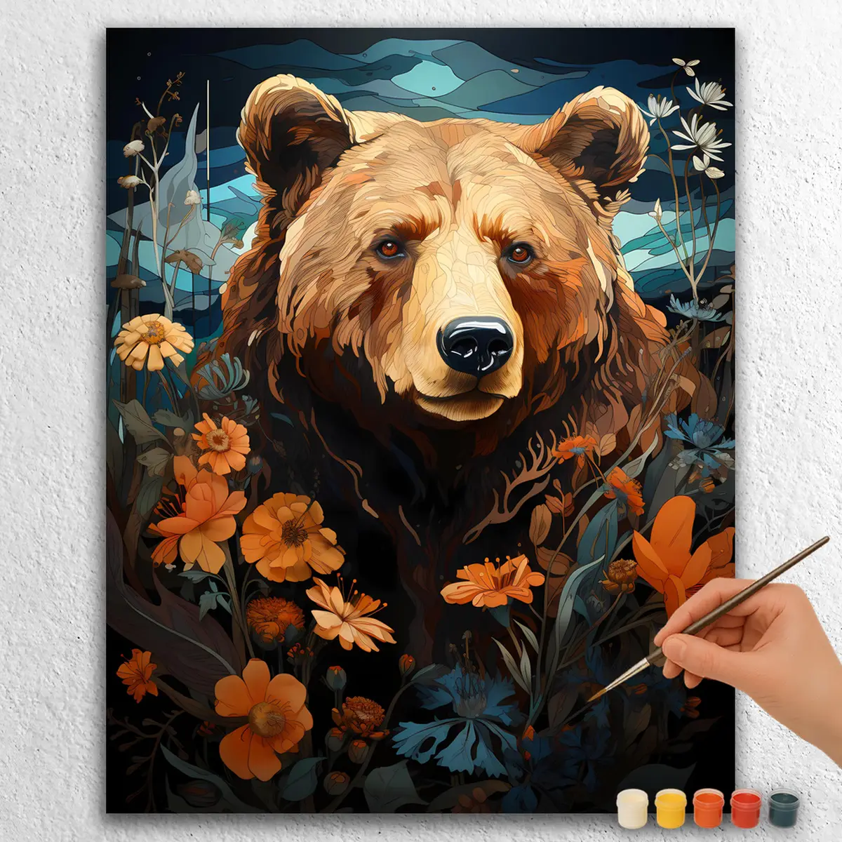 För lugn och ro till ditt hem med “Bear and Flowers”, ett förtjusande målarbilds-kit som föreställer en mild björn omgiven av livfulla blommor. Denna charmiga scen inbjuder dig att utforska din kreativitet och koppla av medan du för den till liv.