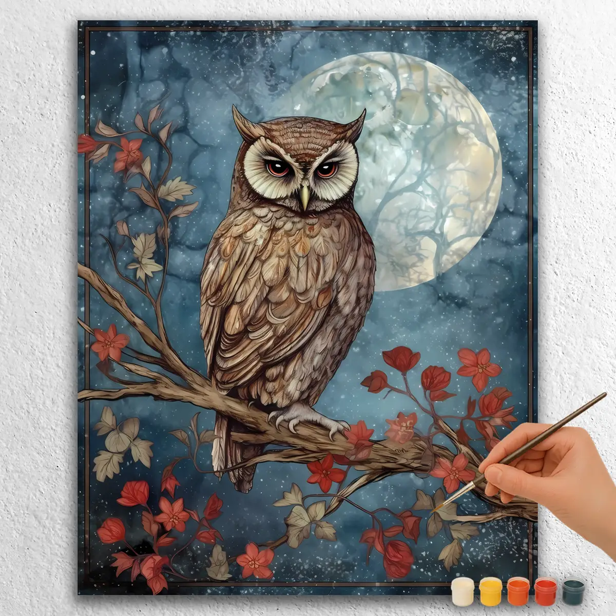 Släpp loss din kreativitet med Enchanted Moon Owl paint-by-numbers-kit. Denna fängslande design föreställer en mystisk uggla sittande under en glödande måne, omgiven av intrikata detaljer som förenar natur och magi.