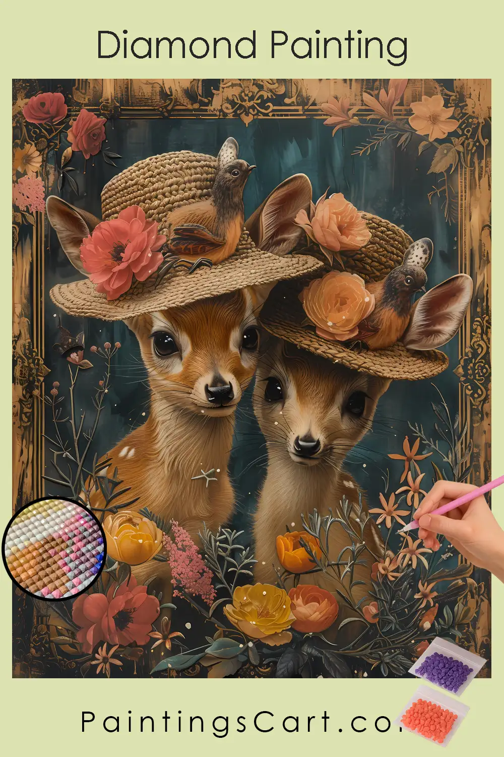 Upptäck naturens sagoliga charm med vår förtrollande Diamond Painting “Två hjortar med hattar”! Detta förtjusande motiv fångar de älskvärda djurens grace i två hjortar, som med fashionabla hattar på huvudet skapar en lekfull och hjärtvärmande scen. Varje glittrande sten hjälper dig att få deras mjuka päls, nyfikna ögon och de charmiga detaljerna i deras huvudbonader att levande. Det är en hyllning till sötman hos vilda djur, fantasins glädje och magin som sådana bilder väcker hos oss. Ett idealiskt Diamantmålning för alla djurälskare som längtar efter värme och en dos förtrollande humor i hemmet.